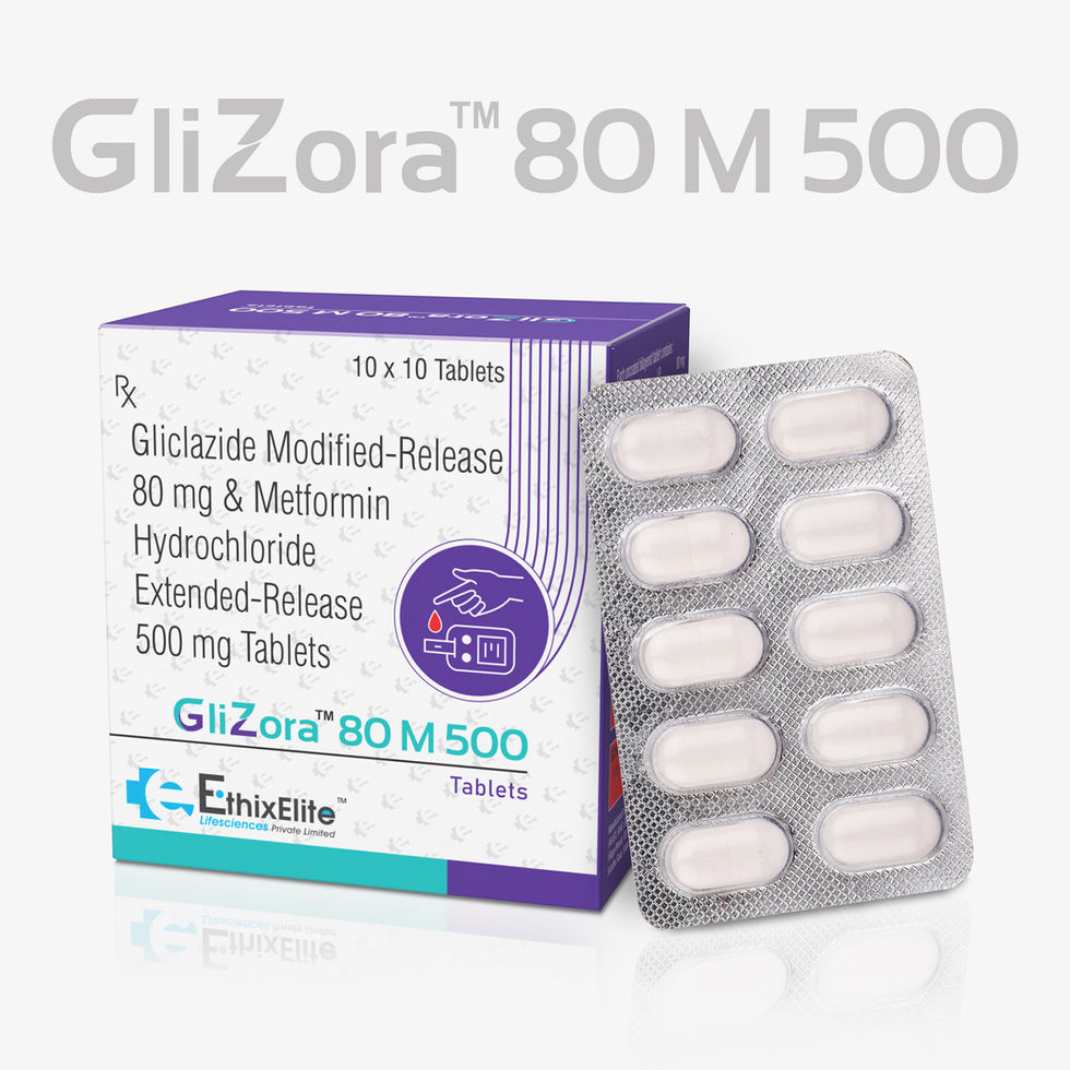 Glizora™-80 M 500 Tablets combine the dual action of Gliclazide, a sulfonylurea, and Metformin, a biguanide, to provide effective glycemic control in patients with Type 2 Diabetes Mellitus (T2DM). This fixed-dose combination improves insulin secretion, reduces hepatic glucose production, and enhances peripheral insulin sensitivity.