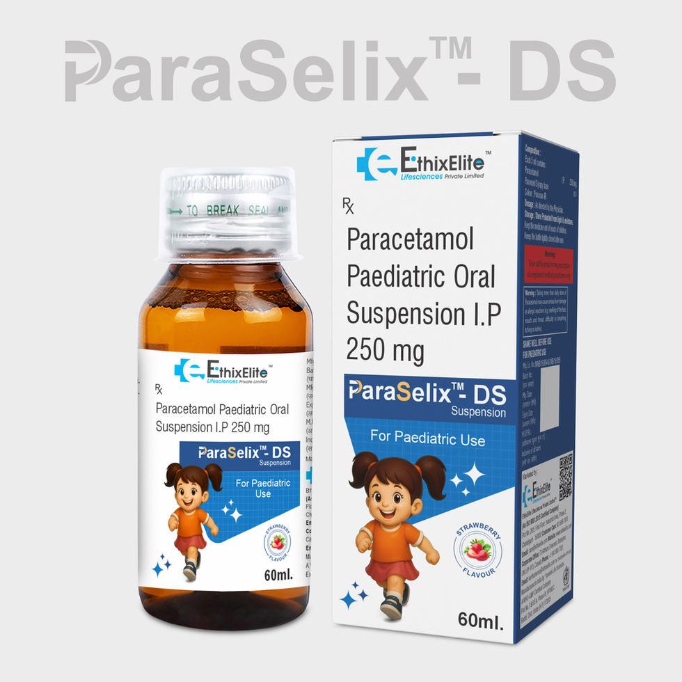 ParaSelix™-DS (commonly called acetaminophen suspension) is an over-the-counter (OTC) medication used as first-line therapy for the treatment of fever and pain. It provides fast and effective relief from headaches, toothaches, backaches, menstrual pain, musculoskeletal pain associated with/without fever. It acts by decreasing the intensity of pain signals to the brain and preventing the release of substances that increases pain and body temperature.